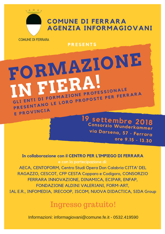 AECA, CENTOFORM, Centro Studi Opera Don Calabria CITTA’ DEL RAGAZZO, CESCOT, CFP CESTA Copparo e Codigoro, CONSORZIO FERRARA INNOVAZIONE, DINAMICA, ECIPAR, ENFAP, FONDAZIONE ALDINI VALERIANI, FORM-ART, IAL E.R., INFOMEDIA, IRECOOP, ISCOM, NUOVA DIDACTICA, SIDA group