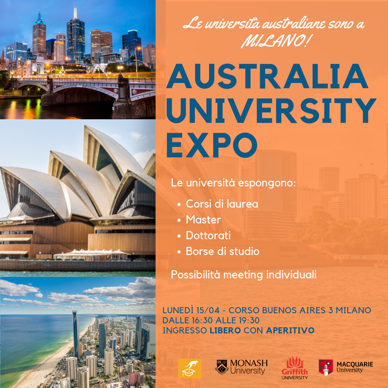 L’incontro sarà dalle ore 16.30 alle 19.30 il giorno 15 Aprile 2019 a Milano con una presentazione di Study Australia per poi terminare con colloqui individuali. Le università presenti rappresentano le tre principali città australiane dove studiare, ovvero Sydney, Melbourne e la Gold Coast.