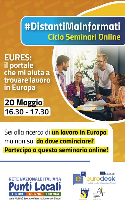Il prossimo appuntamento si terrà Mercoledì 20 Maggio 2020, ore 16:30>17:30, sul tema “EURES: il portale che mi aiuta a trovare lavoro in Europa”