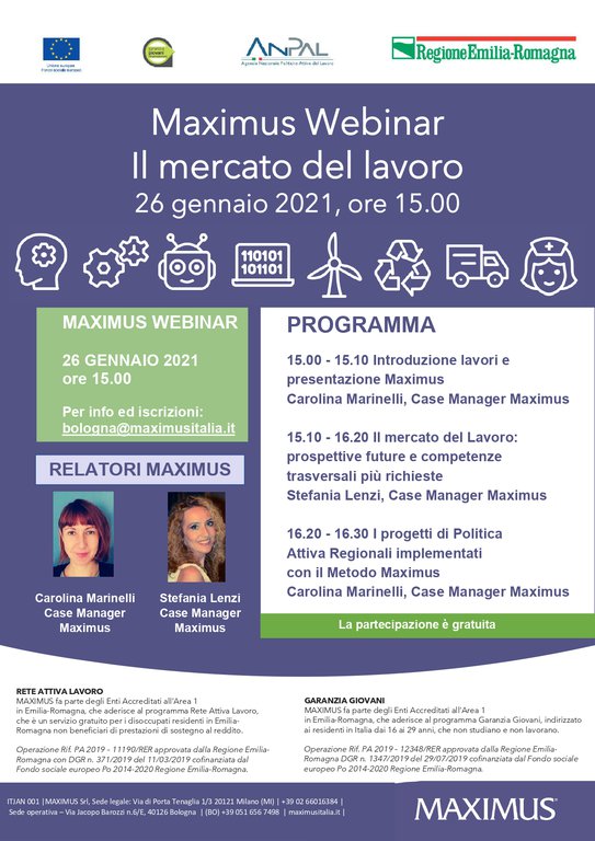 Martedì 26 gennaio alle ore 15.00 si terrà online su piattaforma Teams un webinar gratuito e aperto a tutti “Maximus Webinar: il mercato del lavoro”. Verranno presentati i settori maggiormente in crescita, le prospettive future del mercato del lavoro e le competenze trasversali più richieste dalle aziende. Inoltre parleremo dell’opportunità per persone in cerca di lavoro di partecipare a percorsi di supporto grazie ai programmi di Politica Attiva finanziati dalle Regioni e dal Fondo Sociale Europeo.
