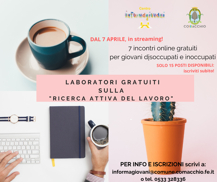 Il Centro Informagiovani del Comune di Comacchio, in collaborazione con l'ente di Formazione CFP Cesta, sta organizzando il "LABORATORI ON LINE: LA RICERCA ATTIVA DEL LAVORO", un ciclo di 7 laboratori pratici, condotti in streaming, dedicati ai NEET e ai disoccupati.