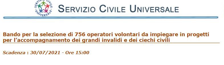 C'è tempo fino al 30 luglio per candidarsi al bando nazionale per la selezione di 756 operatori volontari, da impiegare in 74 progetti di servizio civile per l'accompagnamento dei grandi invalidi e dei ciechi civili presentati dagli enti iscritti all'albo di servizio civile universale.