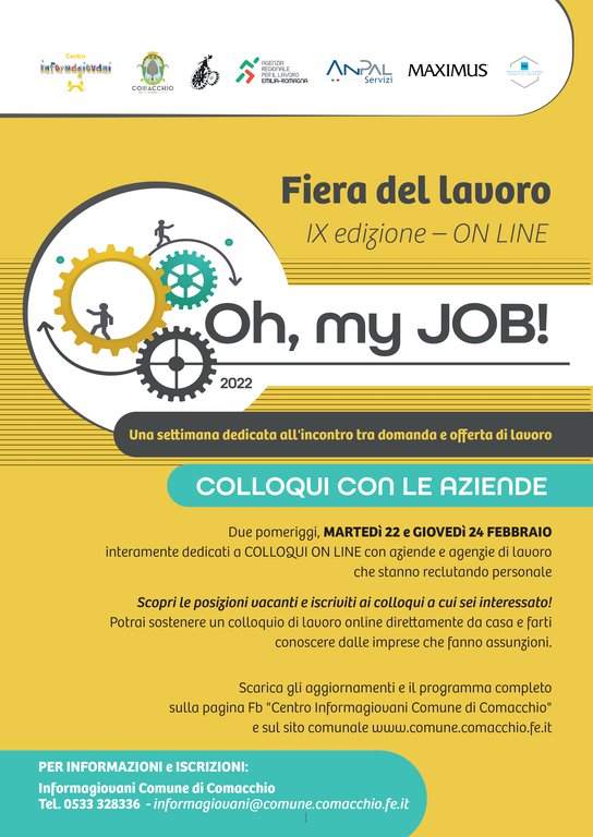 Tutto pronto per la IX edizione di OH MY JOB. La fiera del lavoro organizzata dal Centro Informagiovani del Comune di Comacchio si svolgerà quest'anno ancora online, nella settimana del 21 – 26 febbraio, dando spazio sia alla formazione e che alle opportunità di assunzione.