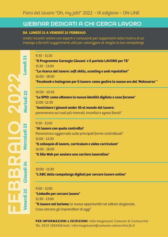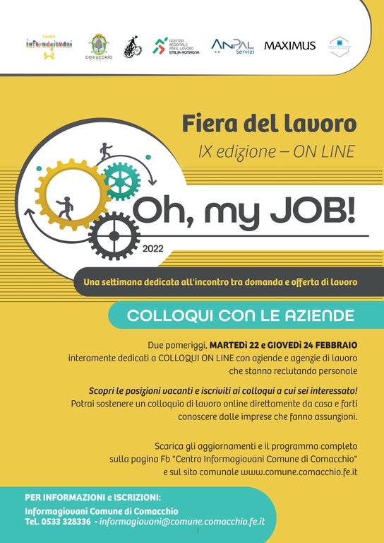 Sono quasi una quarantina, 37 per la precisione, le aziende che hanno aderito alla IX edizione di "Oh, my job" 2022, la fiera del lavoro promossa dal Centro Informagiovani del Comune di Comacchio che si svolgerà dal 21 al 26 febbraio prossimi, interamente su piattaforma online.