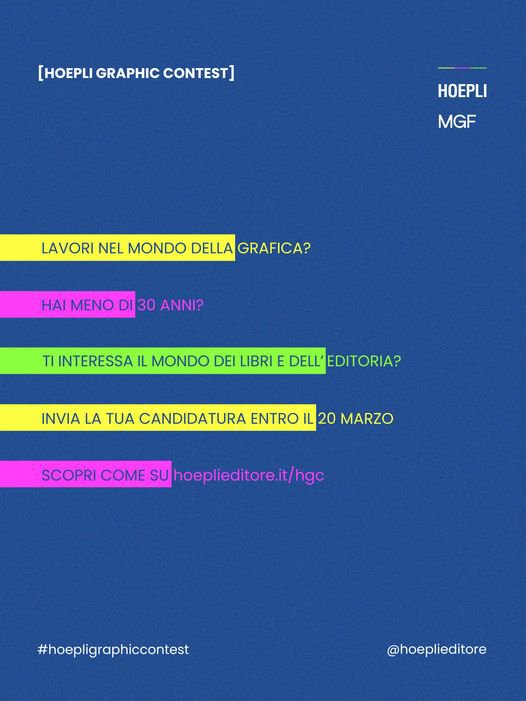 La scadenza per l'invio è domenica 20 marzo ore 23:59. Per il regolamento completo e per scaricare il modulo di iscrizione visitare il sito https://www.hoeplieditore.it/hgc