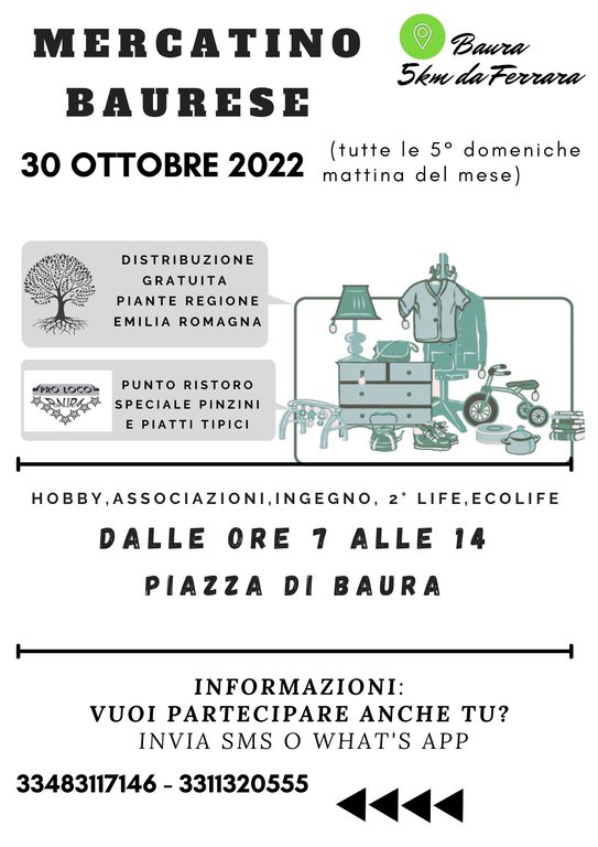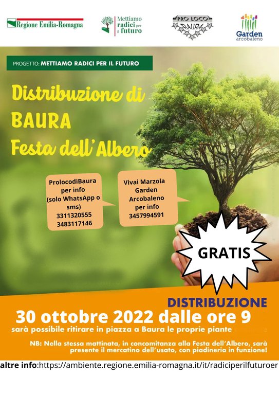 il 30 otobre 2022 dalle ore 9 sarà possibile ritirare in piazza gratuitamente una pianta grazie al progetto "mettiamo radici per il futuro" della Regione Emilia-Romagna. Nella stessa mattinata, in concomitanza alla festa dell'albero, sarà presente il mercatino dell'usato, con piadineria in funzione!