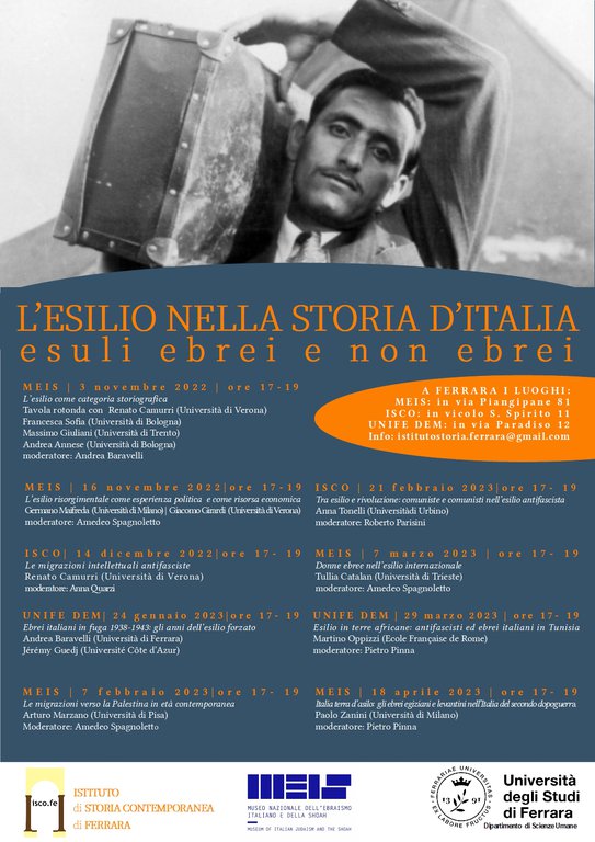 Per vedere il programma degli incontri: https://www.ferraraterraeacqua.it/it/ferrara/eventi/manifestazioni-e-iniziative/congressi-convegni-conferenze-e-seminari/l-esilio-nella-storia-d-italia-esuli-ebrei-e-non-ebrei