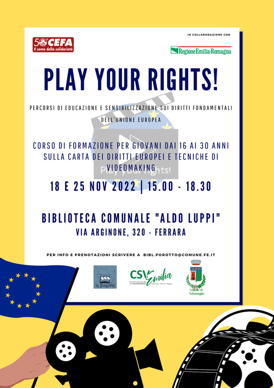 La Cooperativa Le Pagine e il Comune di Ferrara, in collaborazione con Cefa onlus e il sostegno della Regione Emilia Romagna presentano il progetto Play your Rights! Che nasce dall’esigenza di promuovere i valori della cittadinanza europea andando a sensibilizzare i giovani (età 16-30 anni) sulla