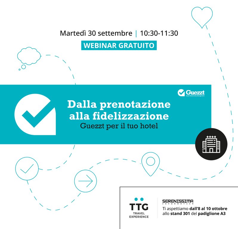 Partecipando al nostro webinar potrai anche prenotare il tuo incontro one-to-one al TTG Travel Experience di Rimini e scoprire Guezzt direttamente allo stand di Serenissima Informatica (padiglione A3, stand 301).
