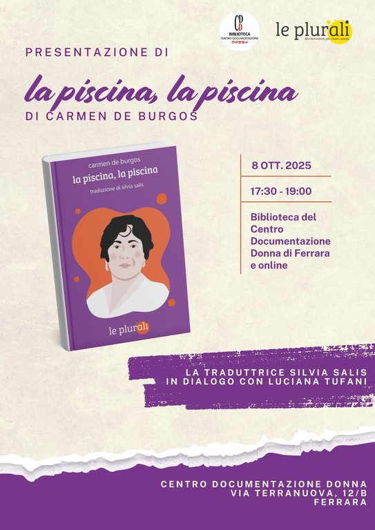 La piscina, la piscina (Le Plurali 2024) è un romanzo breve di Carmen de Burgos, autrice prolifica, giornalista e femminista spagnola (1867-1932). In questo, come in altri suoi romanzi, l’autrice racconta di donne indipendenti che rifiutano gli standard di comportamento femminile imposti dalla società patriarcale. Ironica, affilata, beffarda, de Burgos prende in giro l’arretratezza e l’ipocrisia della famiglia e della società spagnola, mettendo in ridicolo la mentalità machista e chiusa di fronte al percorso inarrestabile delle donne verso la libertà.