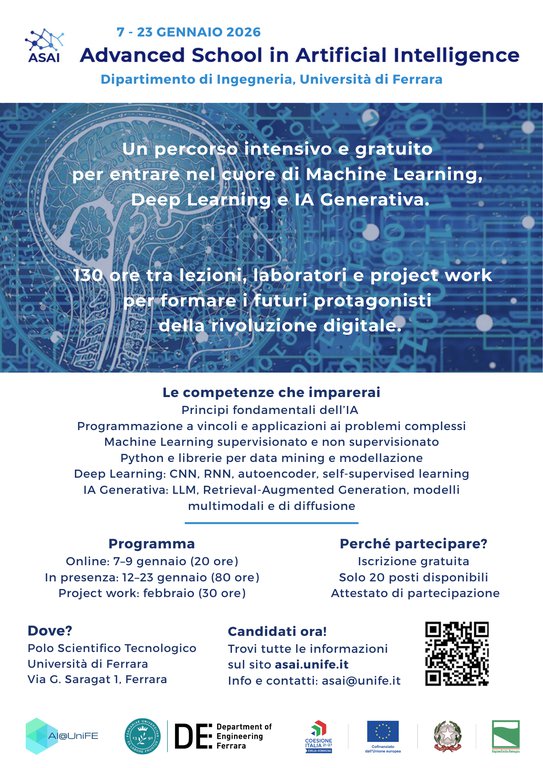 Ferrara, 3 ottobre 2025 - Dopo il successo delle prime due edizioni, torna a gennaio 2026 la Scuola di Alta Formazione “Advanced School in Artificial Intelligence” (ASAI), organizzata dal Dipartimento di Ingegneria dell’Università di Ferrara e finanziata dalla Regione Emilia-Romagna nell’ambito del progetto Advanced Schools in Artificial Intelligence in Emilia-Romagna.