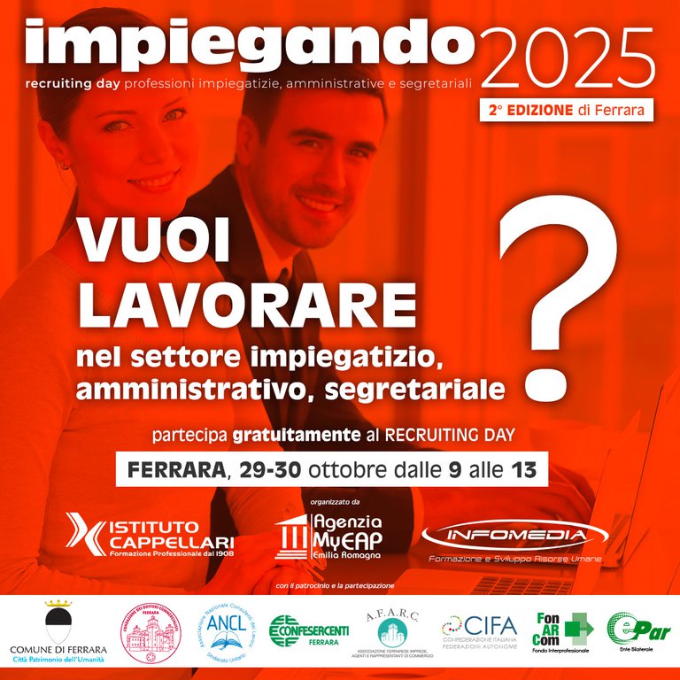 richieste dalle aziende. L’evento è organizzato da Istituto Cappellari, Ferrara Agenzia MyEap Eap e Infomedia Srl con il patrocinio e la partecipazione della Fondazione dell'Ordine dei Dottori Commercialisti e degli Esperti Contabili di Ferrara, ANCL U.P. Ferrara, Confesercenti Ferrara, AFARC - Usarci FERRARA, CIFA Italia, Ente Bilaterale EPAR, FonARCom.