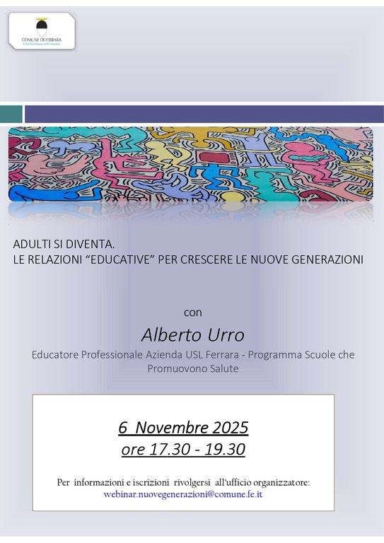 Si terrà giovedì 6 novembre 2025 dalle ore 17.30 alle 19.30 dal titolo “ Adulti si diventa.Le relazioni ”Educative” per crescere le nuove generazioni” condotto dall’ Educatore Professionale USL di Ferrara Alberto Urro.