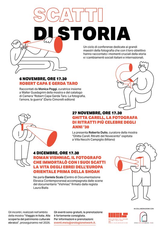 In occasione della mostra "Viaggio in Italia", il MEIS propone nel suo bookshop (via Piangipane 81, Ferrara) la serie di incontri gratuiti “Scatti di storia”: conferenze dedicate a grandi maestri della fotografia che con il loro obiettivo hanno raccontato momenti cruciali della storia e i cambiamenti sociali italiani e internazionali.