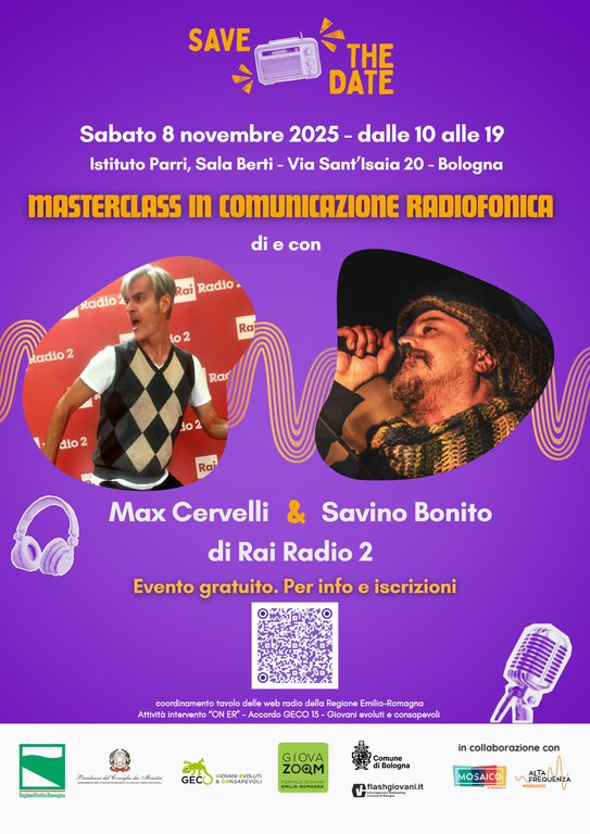Con grande piacere vi invitiamo a questo importante evento gratuito legato alla comunicazione radiofonica che si terrà sabato 8.11 a Bologna presso l’Istituto Parri e finanziato dal Fondo Nazionale Politiche Giovanili – GECO 13 in collaborazione con l’Associazione Mosaico, la radio Alta Frequenza ed il Comune di Bologna nell’ambito del coordinamento delle web radio. Sono invitati tutti i giovani interessati alla radio e non.