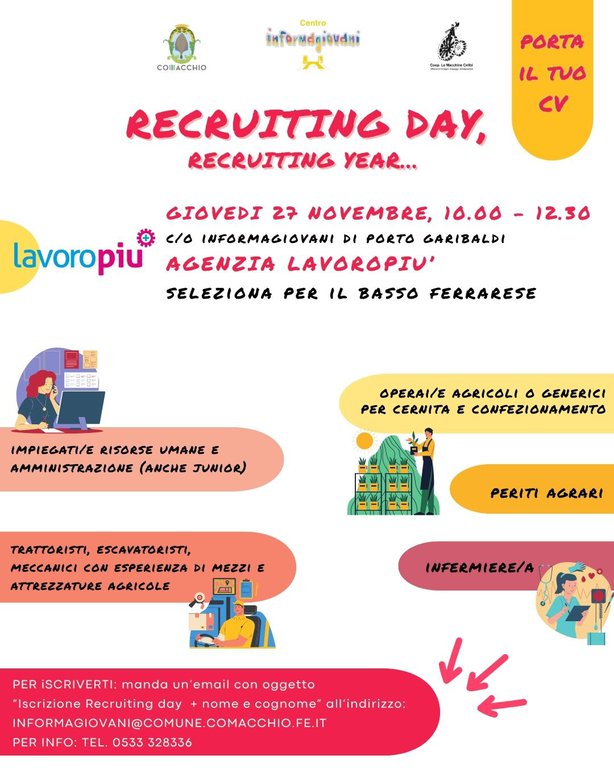 Prossimo recruiting day che ospiterà informagiovani di Comacchio il 27 novembre p.v. presso la sede, in Via Teano 3 a Porto Garibaldi, dalle 10.00 alle 12.30: