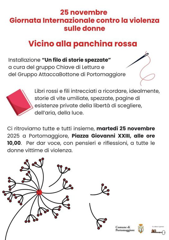Martedì 25 novembre, ore 10 in Piazza Giovanni XIII a Portomaggiore, installazione “Un filo di storie spezzate” a cura del gruppo Chiave di Lettura e del Gruppo Attacca Bottone di Portomaggiore: appuntamento tutti insieme per dare voce, con pensieri e riflessioni, a tutte le donne vittime di violenza.