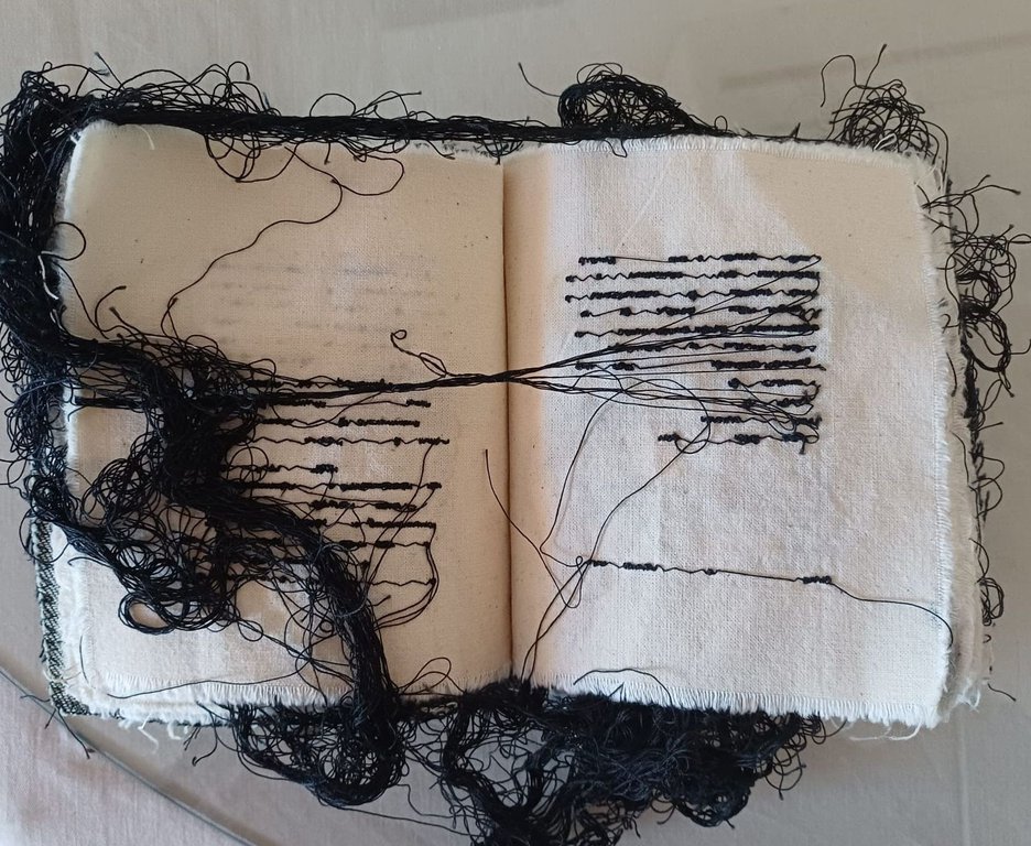 Maria Lai espone i suoi iconici “libri cuciti”, opere tessili che trasformano il filo in scrittura poetica e relazione.