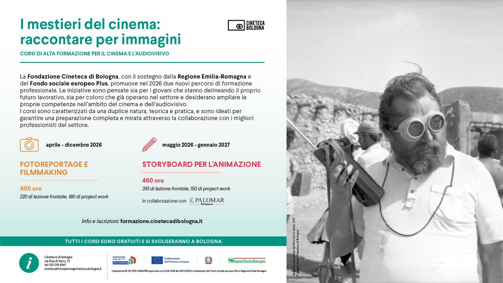 La Cineteca di Bologna propone il progetto formativo: I mestieri del cinema.....raccontare per immagini, con lo scopo di contribuire al consolidamento del sistema regionale dell'audiovisivo e, al contempo, di rispondere alla esigenze delle imprese e delle istituzioni culturali, attraverso la formazione di figure tecniche e creative altamente qualificate.