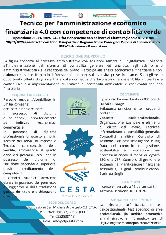 Dove sei: Homepage > Formazione > Notizie Formazione > CFP Cesta - Corso IFTS "Tecnico Amm.ne Economico-Finanziaria"