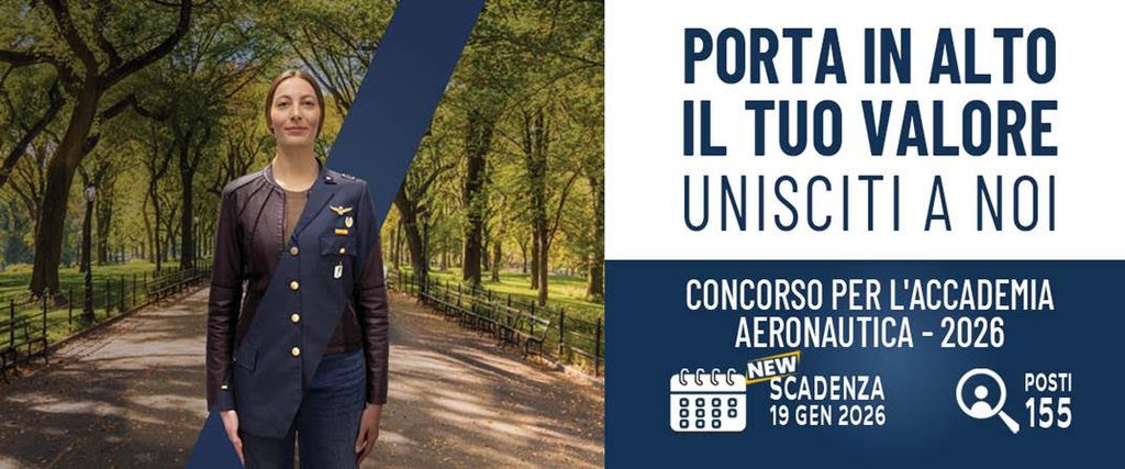 Ti informiamo che il concorso per l'ammissione di 155 Allievi alla prima classe dei corsi regolari dell'Accademia Aeronautica 2026, indetto con decreto dirigenziale n. M_D AB05933 DE12025 0001325 del 4 dicembre 2025, è prorogato fino alle ore 24:00 del 19 gennaio 2026.