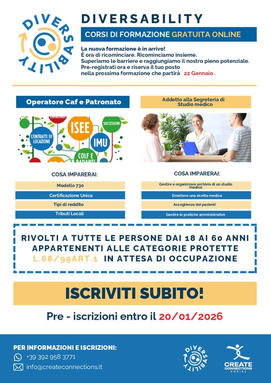 Create Connections, organizzazione che si occupa di formazione professionale gratuita rivolta ad appartenenti a categorie protette in stato di disoccupazione, nel mese di Gennaio partiranno le nuove edizioni dei corsi di: