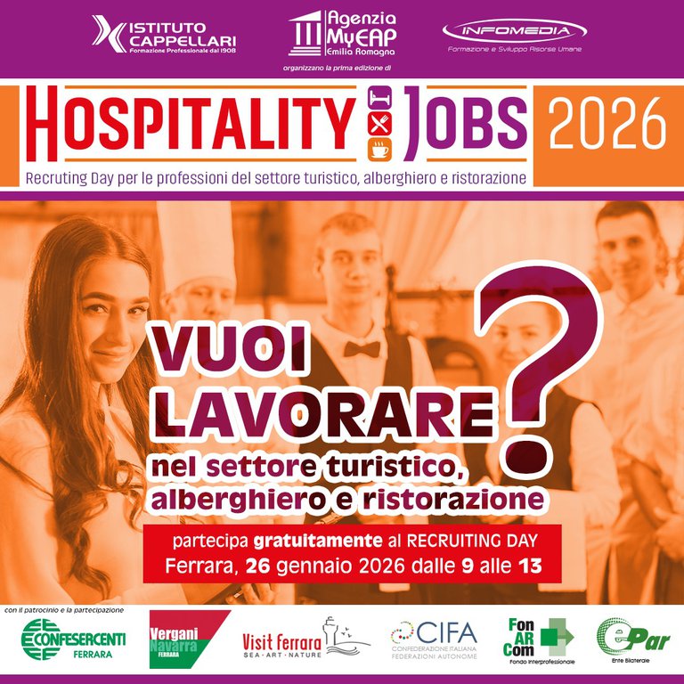 Lunedì 26 gennaio 2026, presso la sala convegni di Istituto Cappellari a Ferrara, si terrà HOSPITALITY JOBS, una giornata interamente dedicata all’incontro tra domanda e