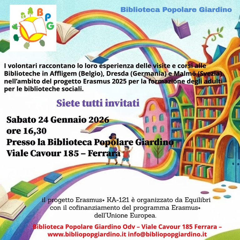 Sabato 24 gennaio alle ore 16.30 la Biblioteca Popolare Giardino invita all’incontro dedicato alle mobilità Erasmus+ KA121 – 2025, organizzate da Equilibriperleggere cooperativa sociale, onlus di Modena.