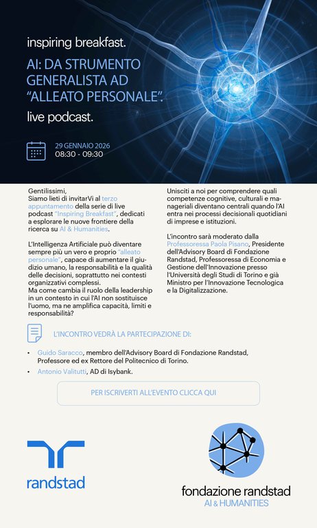 Giovedì 29 gennaio, dalle ore 8:30 alle ore 9:30, terremo il terzo appuntamento della serie live podcast "Inspiring Breakfast" di Fondazione Randstad, dedicata a esplorare le nuove frontiere della ricerca su AI & Humanities.