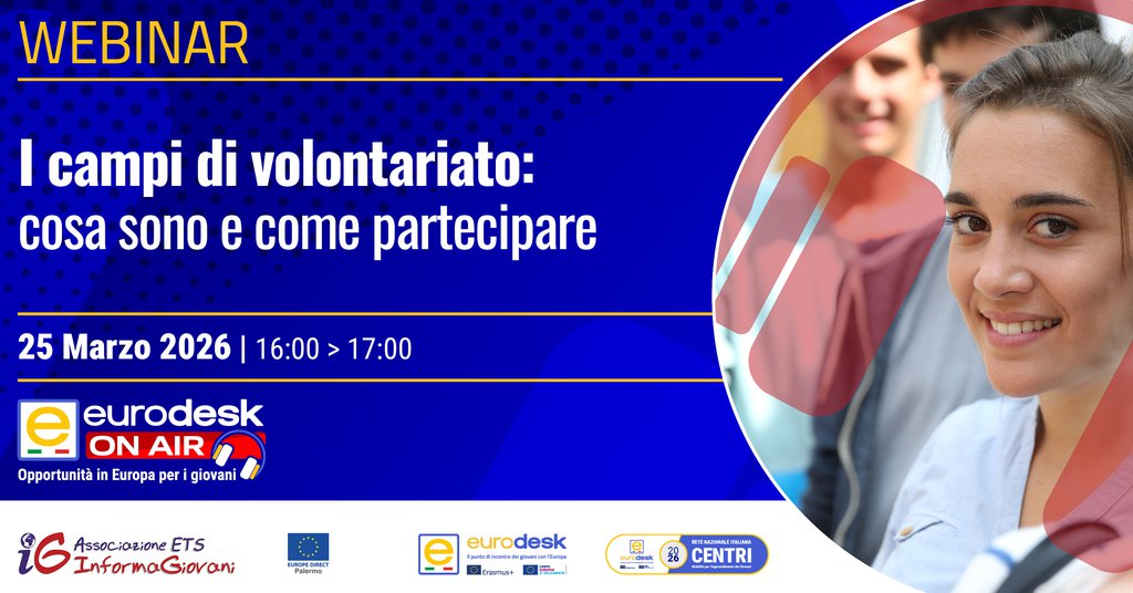Il prossimo webinar, dal titolo “Campi di volontariato: vivi un'esperienza unica!” si terrà mercoledì 25 marzo 2026 dalle ore 16:00 alle 17:00 ed è organizzato in collaborazione con l'associazione Informagiovani di Palermo, Punto Locale Eurodesk.
