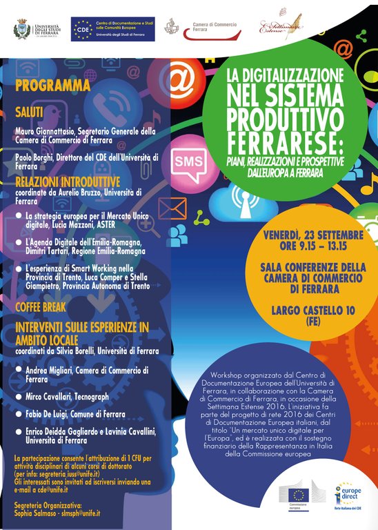 Venerdì 23 settembre 2016 - ore 9.15-13.15 presso la Sala Conferenze della Camera di Commercio di Ferrara - Largo Castello 10 (FE) si terrà un workshop dal titolo "La digitalizzazione nel sistema produttivo ferrarese: piani, realizzazioni e prospettive, dall'Europa a Ferrara" Workshop organizzato dal Centro di Documentazione e Studi sulle Comunità Europee dell’Università di Ferrara, in collaborazione con la Camera di Commercio di Ferrara, in occasione della Settimana Estense 2016. L’iniziativa fa parte del Progetto di rete 2016 dei Centri di Documentazione Europea italiani, dal titolo “Un mercato unico digitale per l’Europa”, ed è realizzata con il sostegno finanziario della Rappresentanza in Italia della Commissione europea.