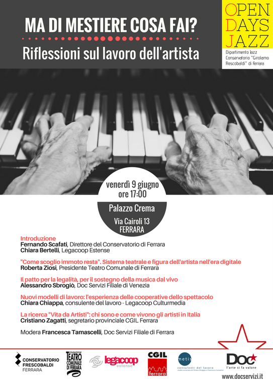 Doc Servizi Ferrara, cooperativa di professionisti dello spettacolo e della cultura, organizza un dibattito all'interno degli Open Days del Conservatorio Frescobaldi di Ferrara, che si terranno a Palazzo Crema il 9 e il 10 giugno. Sarà l’occasione per affrontare temi di attualità legati alle professioni dell’arte e della cultura, grazie al confronto con esperti del settore.