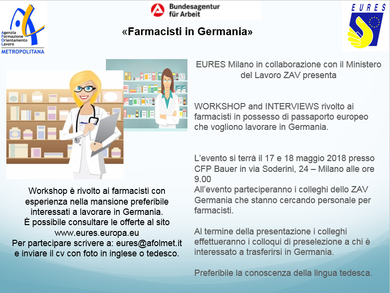 Eures Milano organizza un evento importante rivolto ai farmacisti che vogliono lavorare in Germania: l'appuntamento è per il 17 e 18 maggio 2018 presso CFP Bauer in via Soderini, 24 – Milano alle ore 9.00 (locandine in allegato). All'evento saranno presenti colleghe della Germania e azienda tedesca.