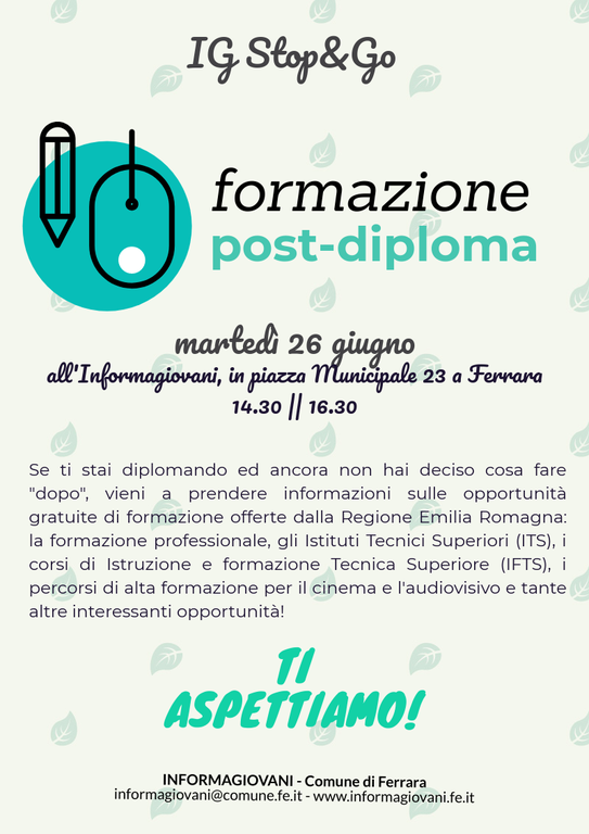 se ti stai diplomando e ancora non hai deciso cosa fare "dopo", vieni ad informarti sulle opportunità gratuite di formazione offerte dalla Regione Emilia Romagna: corsi di formazione professionale, Istituti Tecnici superiori (ITS), corsi di Istruzione e formazione Tecnica Superiore (IFTS), percorsi di alta formazione per il cinema e l'audiovisivo e tante altre possibilità.
