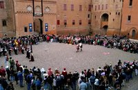 Nella splendida cornice della Piazza Castello, accanto al Castello Estense, le otto contrade rendono omaggio al Duca di Ferrara, portando in dono prodotti locali, oggetti di artigianato e rappresentando al suo cospetto giochi e coreografie che fanno rivivere l’atmosfera della grande epoca estense